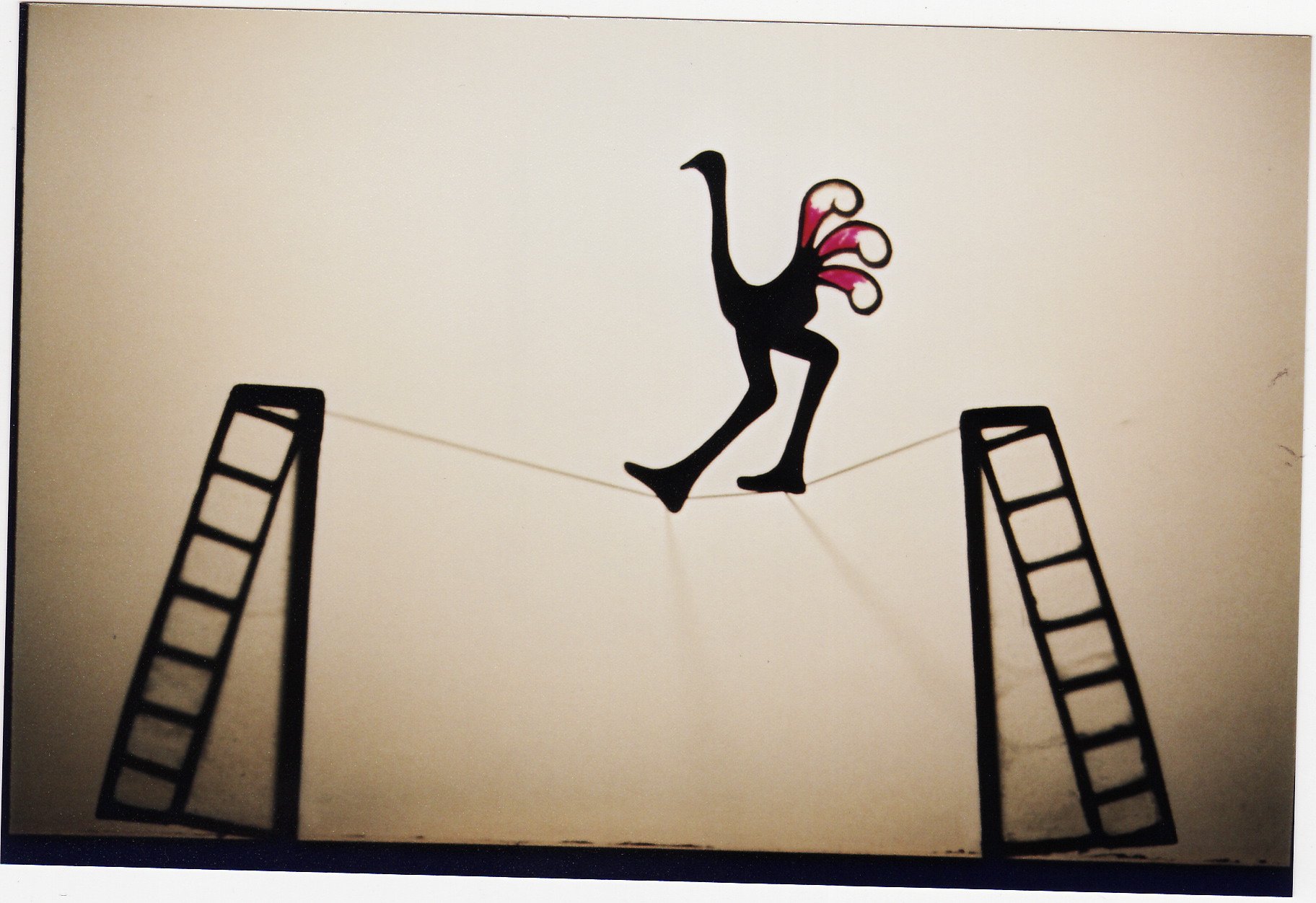 Ostrich shadow puppet walking across a shadow tightrope